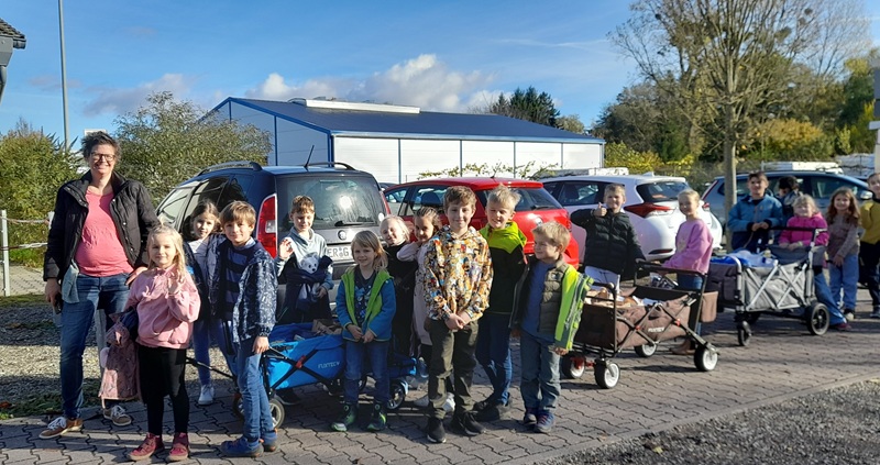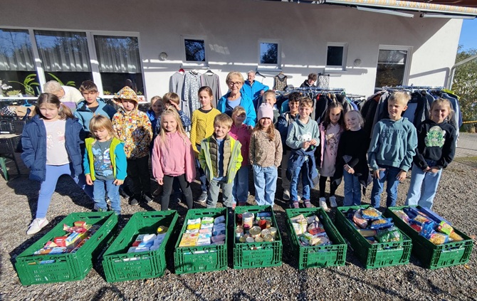 Schüler der Dammschule Wörth und die Lehrerin Simone Moch überraschten die Tafel mit vielen gesammelten Lebensmitteln für die Tafelkinder