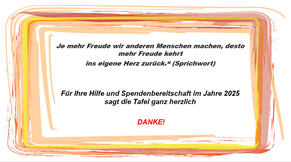 Vielen, vielen Dank an alle Beteiligten für ihr Engagement der Tafel gegenüber. Diese weiß das mehr als zu würdigen.